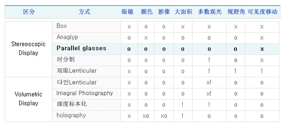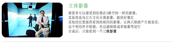 把传送的影像转换为INTERLECD SIGNAL后,在右眼和左眼按顺序显示影像的方式,为了看到立 体影像, 大型影像需要SIGNAL SLPITTER, PC需要 LCD SHUTTER GLASSES。